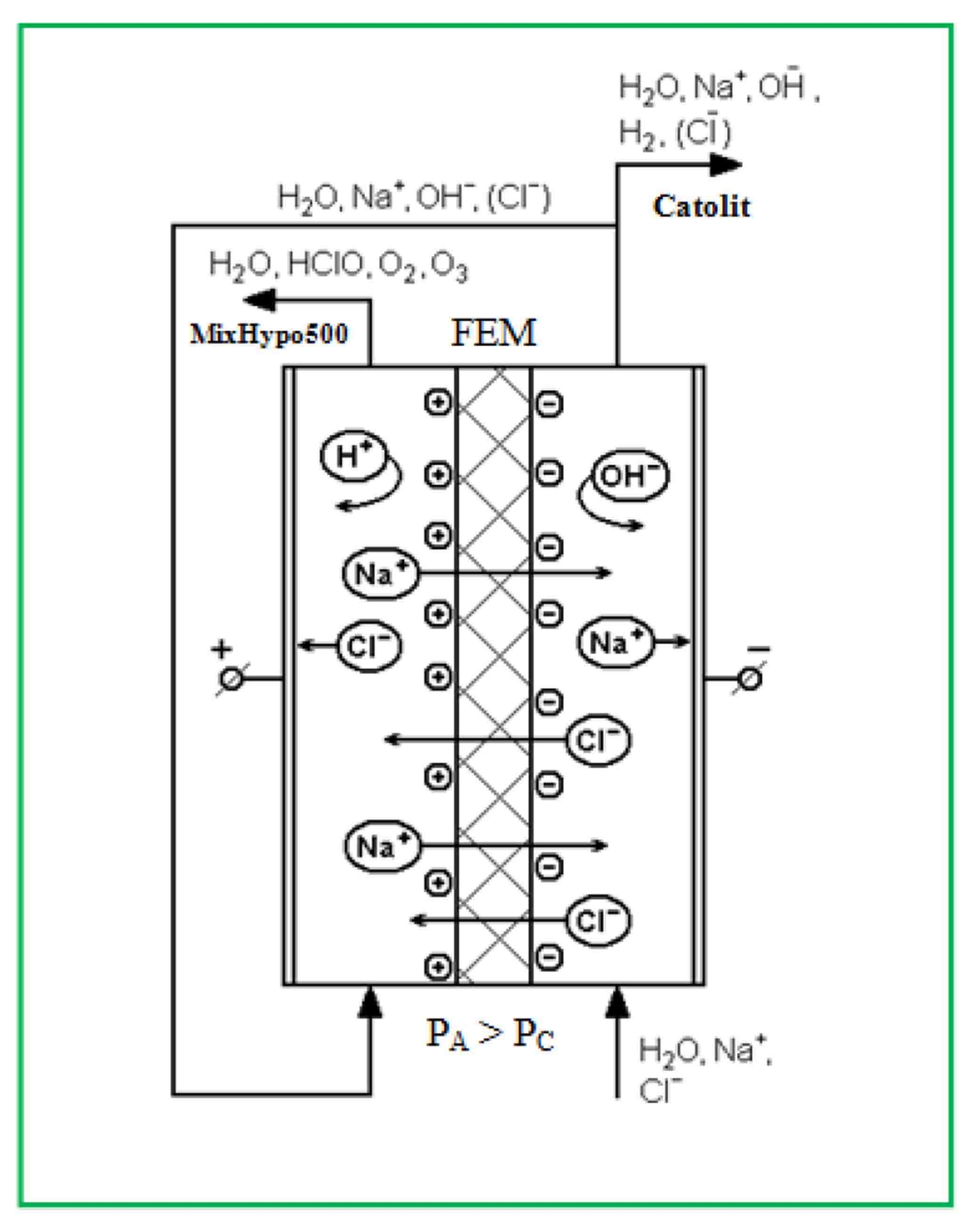 MixHypo500 là dung dịch nước muối hoạt hóa điện hóa siêu ôxi hóa được tạo thành trong buồng phản ứng điện hóa đặc biệt dạng dòng chảy, có màng ngăn FEM (flow through electrolytic module, xem hình 1, 2) của thiết bị điện hóa kiểu STEL (Các thiết bị chuyên sản xuất các dung dịch khử trùng, sát trùng và tẩy rửa được gọi chung là thiết bị STEL- sterility electrochemistry, xem hình 3). Dưới những tác động lý hóa của dòng điện xảy ra trong lớp tiếp xúc giữa điện cực và dung dịch, nhiều chất siêu ôxi hóa có tính khử trùng mạnh được tạo thành như: HClO, ClO-,O2, OH*…